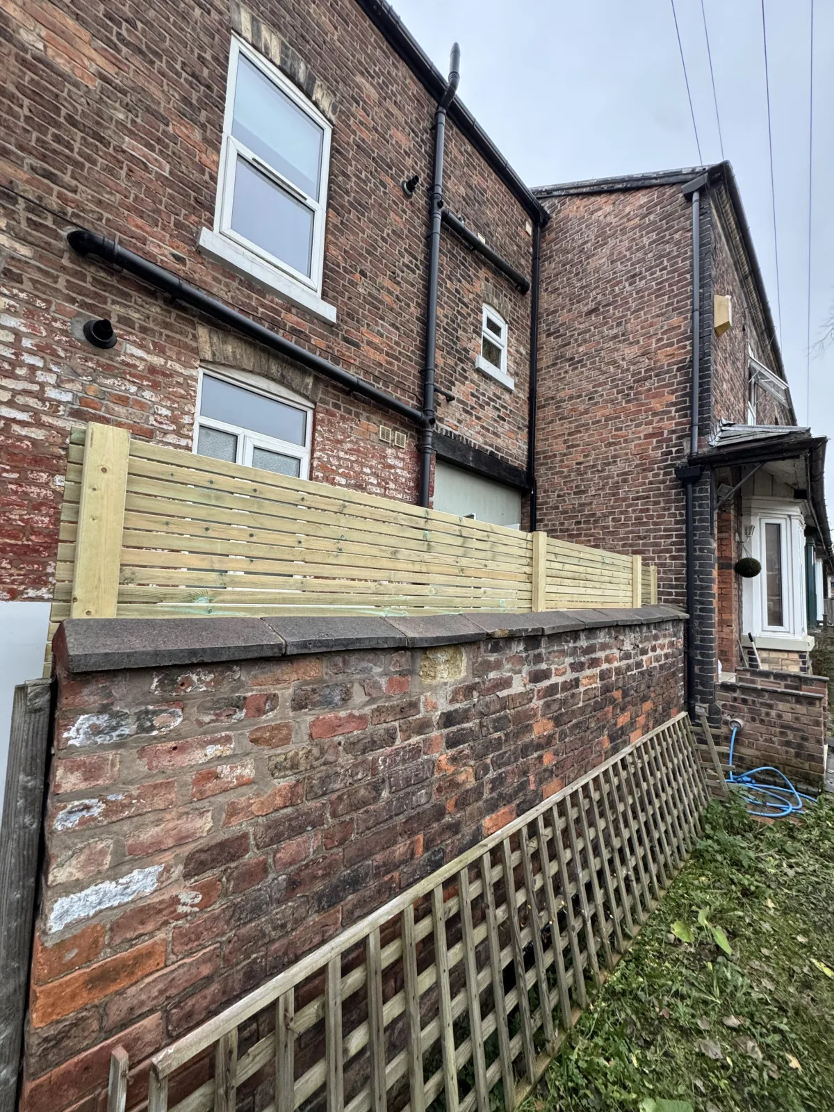 Venetian fencing is a modern style of garden fencing made from horizontal slats with small gaps between each board. It offers privacy while still allowing light and airflow — perfect for gardens around Stockport and Greater Manchester.